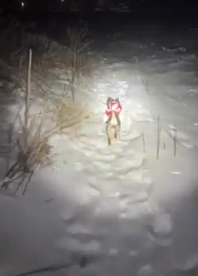 At night, a dog walks through a snowy path, illuminated by a headlamp. The path is narrow and slightly uphill, with bushes and thin trees lining the sides. The dog wears a red pack on its back. In the distance, dim lights suggest a town or settlement. The scene is starkly lit by the headlamp, casting deep shadows.