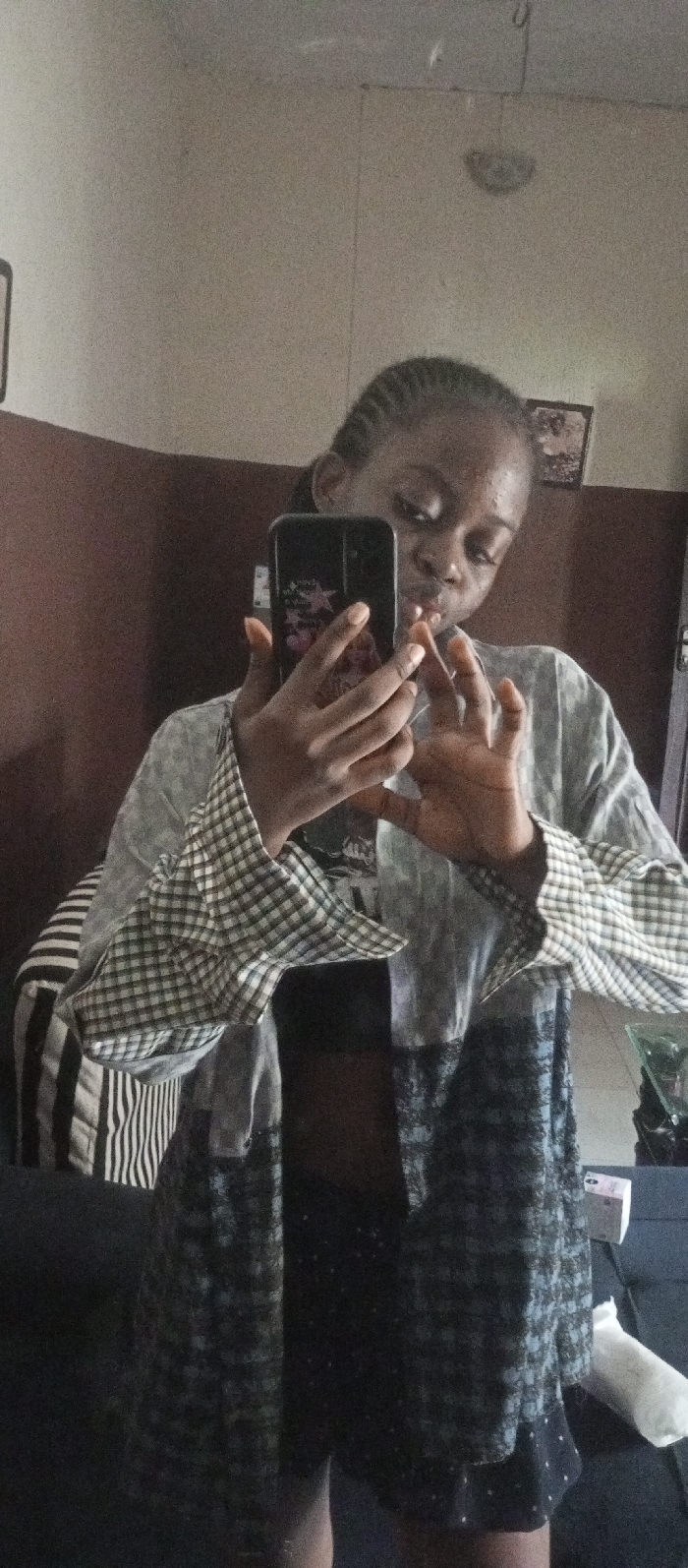 The image depicts an indoor mirror selfie taken in Abuja, Nigeria. A young individual with dark skin and braided hair is shown from the chest up, holding a black smartphone with both hands, capturing their reflection. The subject wears a light-colored, long-sleeved top with checkered cuffs and a striped underside visible on the left sleeve, layered over a dark bralette or camisole. Dark shorts or a skirt with faint white dots are visible below the top. The reflected background includes light-colored walls, a ceiling with a visible light fixture, and a dark brown or maroon wall section or piece of furniture. A dark-framed picture hangs on the wall behind the subject's right shoulder. A dark, striped piece of furniture, likely a sofa, is partially visible on the lower left, while a white, folded object rests on a dark surface on the lower right.