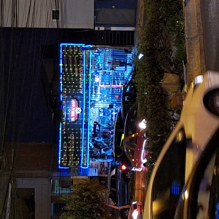 A vibrant storefront illuminated with blue neon lights showcases the words "ALNERCION DE RIC." Other signs and merchandise are visible within. Outside, vehicles are parked along the street. Lush greenery spills from the side of the building, softening the urban setting. The street is paved, and a streetlight casts a glow.