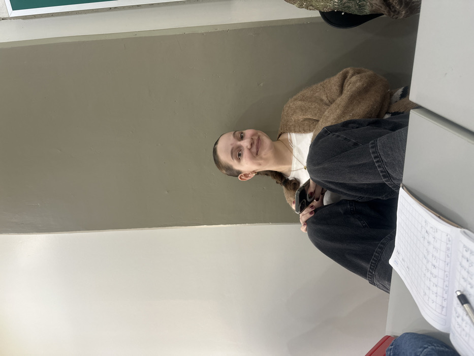 A young woman smiles, sitting cross-legged indoors. She wears a brown cardigan over a white shirt and dark-wash jeans. Her hair is pulled back in a braid. She holds a phone in her hands. A notebook with handwritten notes and a pen are visible on a table in the foreground. The walls are painted white and beige. A green sign hangs in the background.