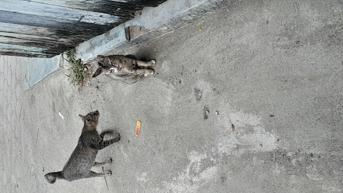 - "This image depicts an outdoor scene in Lhokseumawe, Indonesia, featuring two domestic tabby cats on a concrete surface adjacent to a weathered wooden structure" by FM-hcL462, licensed under CC BY 4.0