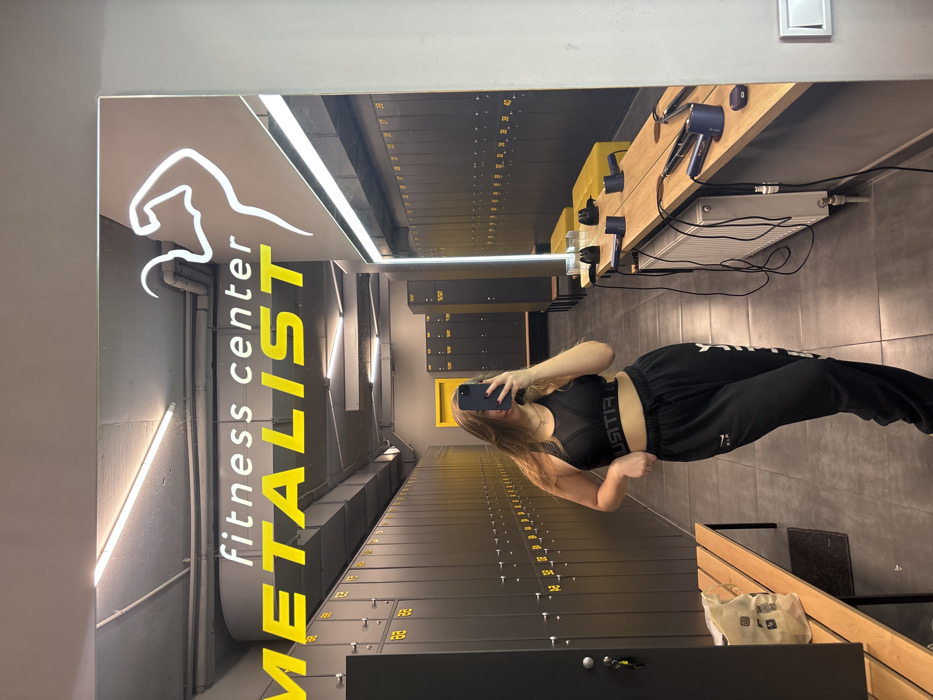 The image depicts a female individual taking a mirror selfie inside what is identified as the "fitness center METALIST" in Kharkiv, Ukraine