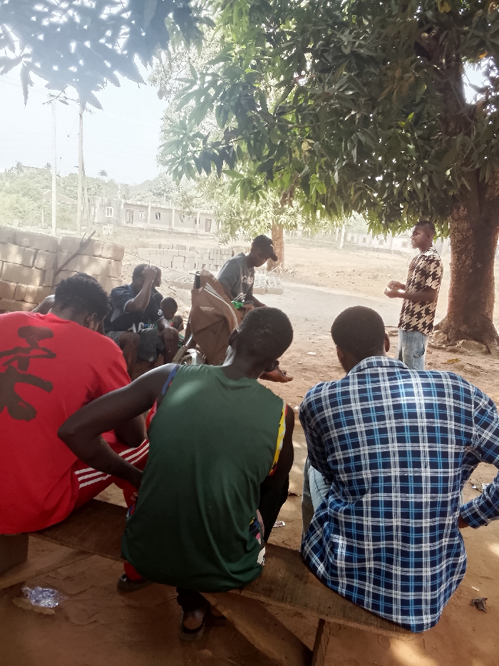 Several people are gathered outdoors, some seated on a wooden bench. One person stands and appears to be speaking or gesturing towards the group. There are bricks stacked nearby, with a partially constructed building visible in the background. A large tree provides shade over the assembly. Most people are wearing casual clothing. The scene appears to be a social gathering in a rural or semi-rural environment.