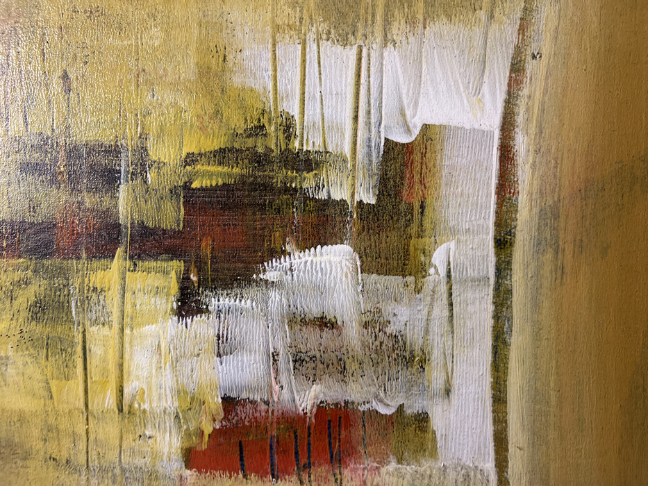 An abstract painting presents a textured surface with a mix of colors. Yellow, brown, and white hues dominate, applied with visible brushstrokes. The white paint is particularly prominent, creating vertical stripes that break up the other colors. Hints of red and black add depth to the composition. The painting has a raw, unfinished quality, drawing attention to the materiality of the paint.