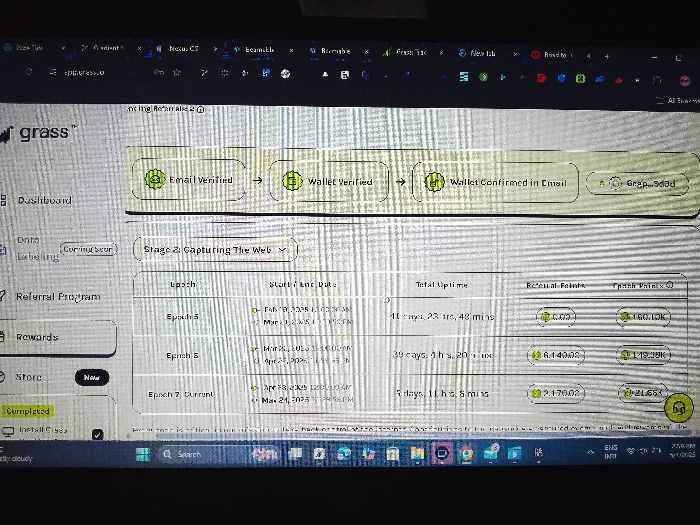 laptop screen displaying a website. The website is for a company called "grass" and appears to be an online platform for data labeling and annotation. The screen shows a dashboard with various options, including "Dashboard," "Data Labeling," "Referral Program," "Rewards," "Store," and "Completed." The website also displays a progress bar with three stages labeled "Email Verified," "Wallet Verified," and "Wallet Confirmed in Email." The stage labeled "Capturing The Web" appears to be in progress. The table below this progress bar shows the start and end date for each stage of the project. The table also shows the total uptime, total points, and referral points for each stage. The laptop is being used in Ruaka, Kenya (latitude: -1.207, longitude: 36.783). The image shows the screen of a laptop in a dimly lit room. The laptop is facing the camera. The screen is displaying a website for a company called "grass." The website is for a company called "grass" and appears to be an online platform for data labeling and annotation. The screen shows a dashboard with various options, including "Dashboard," "Data Labeling," "Referral Program," "Rewards," "Store," and "Completed." The website also displays a progress bar with three stages labeled "Email Verified," "Wallet Verified," and "Wallet Confirmed in Email." The stage labeled "Capturing The Web" appears to be in progress. The table below this progress bar shows the start and end date for each stage of the project. The table also shows the total uptime, total points, and referral points for each stage. The image shows the screen of a laptop in a dimly lit room. The laptop is facing the camera. The screen is displaying a website for a company called "grass."