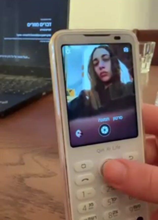 A hand holds a white QIN AI LIFE phone, displaying a selfie of a person with dark hair and a light complexion. The person in the selfie has dark lipstick on. The phone's camera interface is visible. The hand presses the center button of the phone. A laptop with a dark screen and text in Hebrew rests in the background on a wooden table. A clear glass is also visible on the table. The overall setting appears to be indoors.