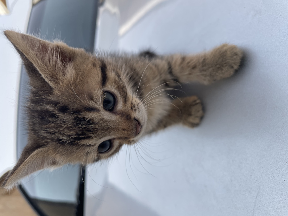 - "The image displays a small tabby kitten standing on the light-colored, reflective surface of a vehicle, likely a car, in Narayi, Nigeria" by FM-eIoso2, licensed under CC BY 4.0