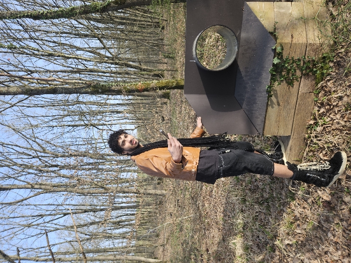 A male individual stands in a sparse wooded area, identified as Marcoussis, France, under a clear blue sky. He possesses dark, curly hair and a beard, and wears a tan leather jacket, a black t-shirt, dark shorts, and tall, black lace-up boots with white soles. He holds a dark-colored mobile phone in his left hand, and his right hand rests on a dark, angled metal structure. This structure features a circular opening, approximately 30-40 cm in diameter, allowing a view through to the background foliage. The metal structure is mounted on a base constructed from two horizontal wooden beams. Ground cover consists of dry leaves, sparse green grass, and some ivy growing on the wooden base. The surrounding environment is characterized by numerous tall, bare deciduous trees, indicating a late winter or early spring season. The man is looking towards the camera.