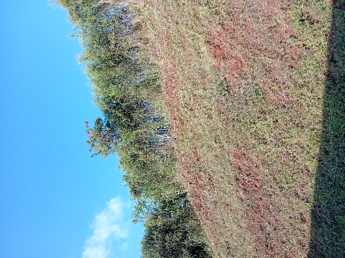 A blue sky with wisps of clouds peeks through the edge of a tree line. The right side of the frame is dominated by a dense, shadowed area of reddish-brown grass and foliage. Sunlight and shadow create patterns across the textured surface. The ground appears to be a mix of grass and exposed soil, indicating a natural outdoor setting.