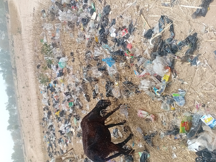 The image portrays an open, dry land area in Ayama, Nigeria, heavily covered with refuse