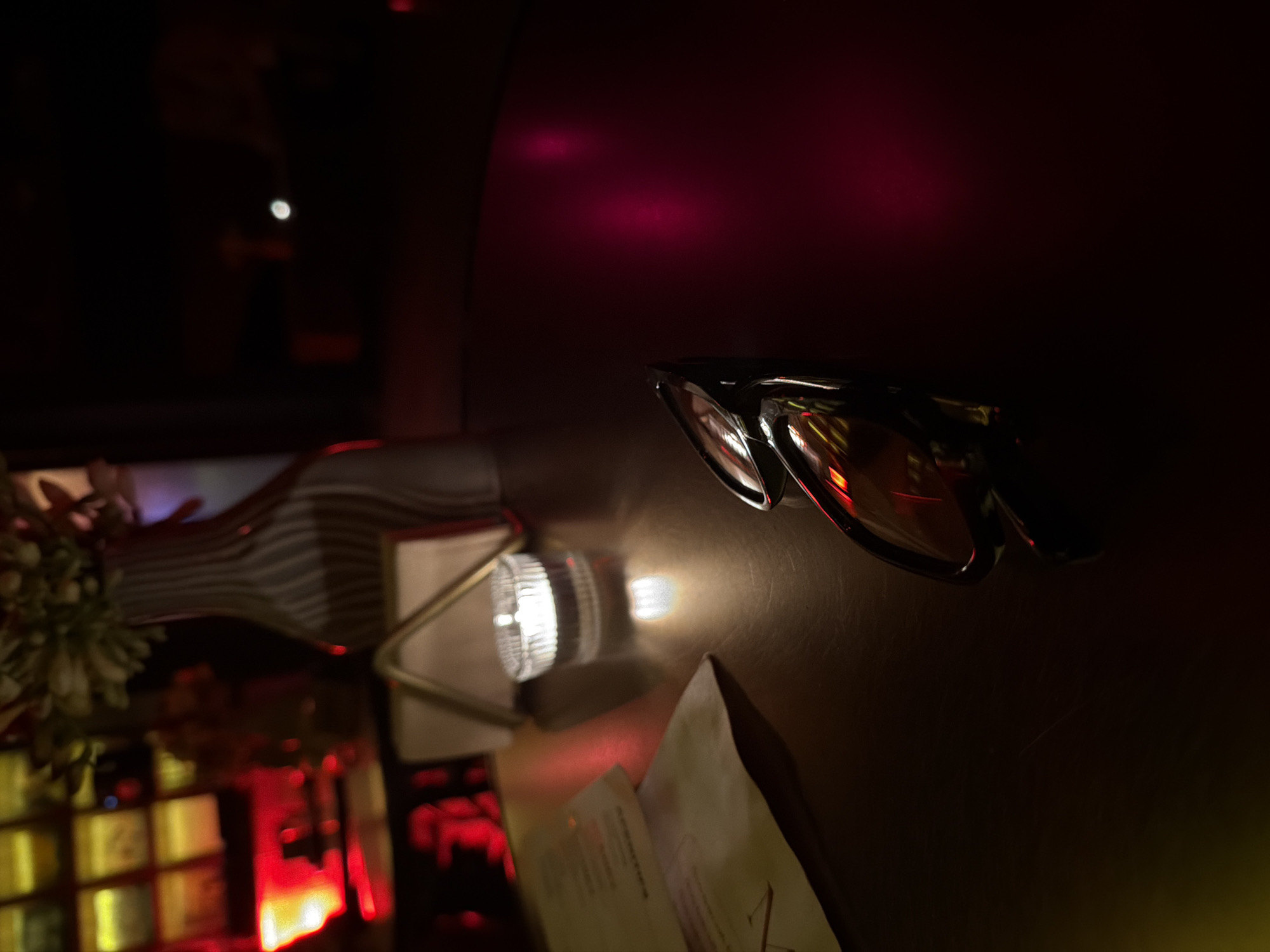 dimly lit table in what appears to be a bar or restaurant. On the table are a pair of sunglasses, a menu or papers, a small lamp with a textured shade, and a bottle with a striped pattern. A small flower arrangement is partially visible on the left. Reflections of red and yellow lights are present in the foreground and background. No people are directly visible. The location in Yerevan, Armenia, is not discernible from the image alone.