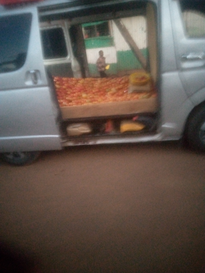 A silver van is parked on a dirt road, its sliding door open. Inside, the van is filled with a dense layer of ripe tomatoes. Beneath the tomatoes, various items, including bags and a yellow object, are visible. Through the open door, a building with green and white paint is partially visible, and a person stands in front of it. The overall scene suggests a mobile market or a vendor selling tomatoes directly from their vehicle.