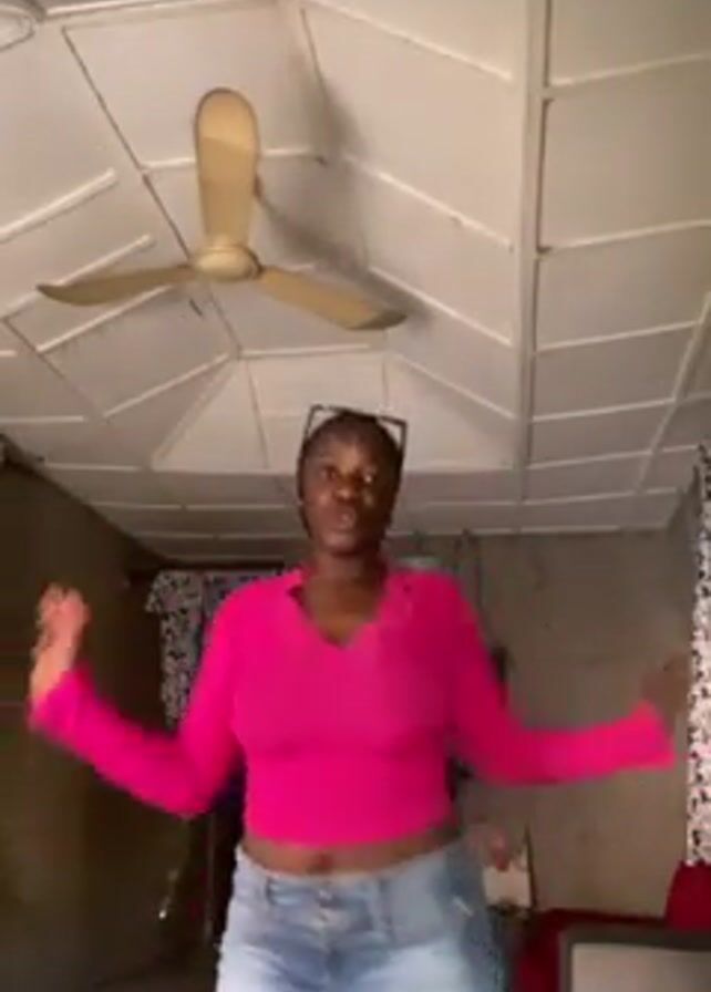 A young Black woman in a pink long-sleeved lace-trimmed crop top and a denim mini-skirt is dancing in a room with a white ceiling, a rotating ceiling fan, and a window covered by a black and white patterned curtain. The room also contains a television, a piece of furniture, and a framed portrait on the wall. The woman is facing the camera, moving her arms and body to the beat of music.