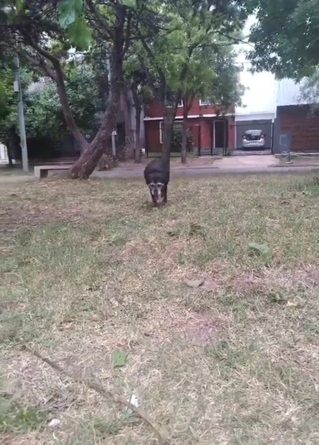 black and white dog walking towards the camera in a grassy field. The dog appears to be an older dog, with grey fur around its muzzle and white paws. It is panting with its tongue out. In the background, there are trees, houses, and a person walking across the street. The grass in the field is a mix of green and brown, with some patches of dirt and fallen leaves. There is also a small stick in the foreground.
