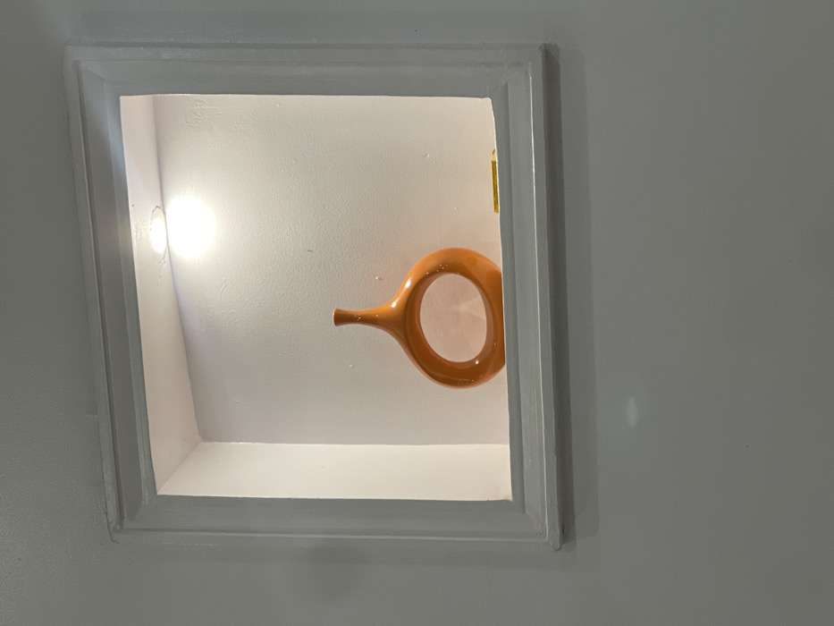 The scene depicts a brightly illuminated, recessed architectural niche within a white wall, observed in an indoor environment in Bar Jirgi Summa, Nigeria. The rectangular alcove features white interior surfaces and is framed by white decorative molding. A single, round, recessed light fixture is positioned at the top center of the alcove, casting warm light downwards. A glossy, orange decorative vase, possibly ceramic or glass, is centrally placed within the niche. The vase has a narrow neck, a flattened oval body, and a distinctive large oval-shaped opening through its center. To the right of the vase, a small, rectangular yellow object rests on the base of the alcove. No individuals, actions, or specific environmental identifiers beyond the structural elements are present.