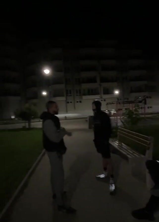three men in a park at night. The park is lit by streetlights. One man is standing and talking to another man who is wearing a hooded sweatshirt. A third man is sitting on a bench, looking at his phone. The video then pans to show a children's playground in the background.