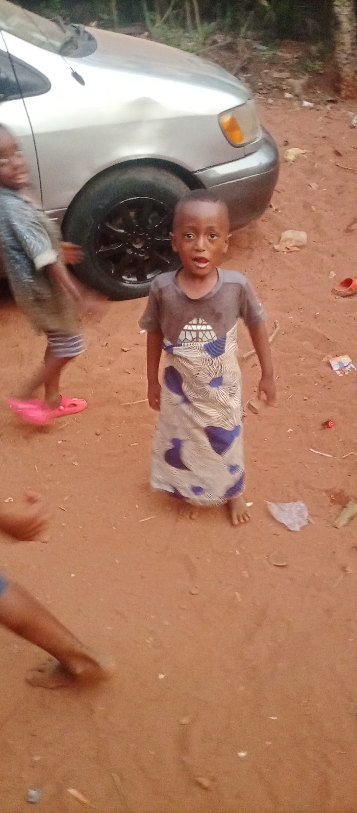 A young boy stands barefoot in a dirt yard, wearing a gray t-shirt and a patterned cloth wrapped around his waist. His mouth is open, as if speaking or surprised. Another child in casual clothing is partially visible to the left, wearing pink shoes. A silver minivan is parked behind the children, and scattered trash and debris litter the ground. The setting appears to be outdoors, possibly a residential area.