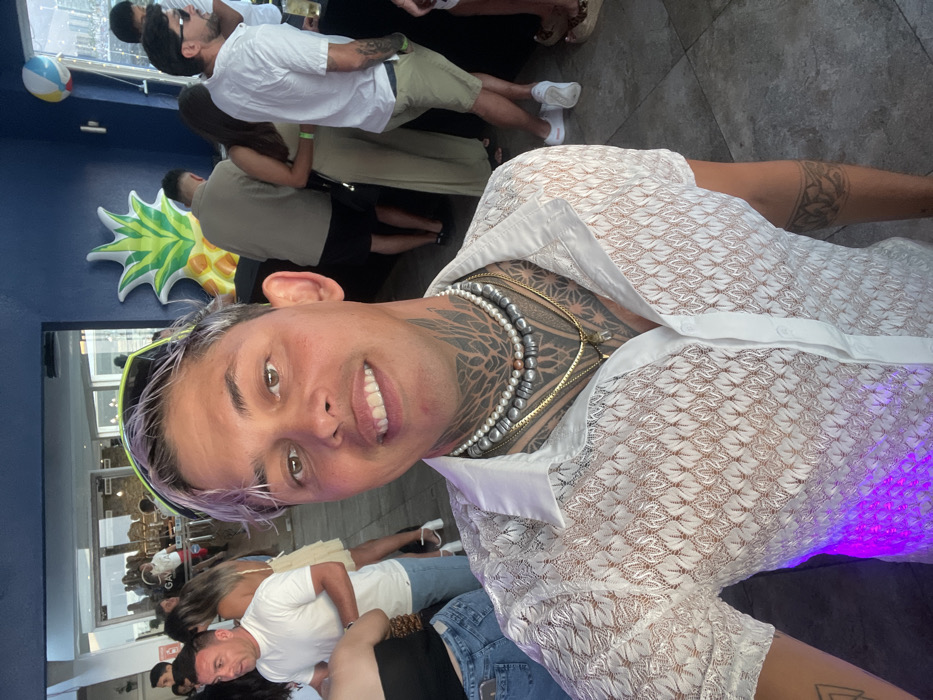 A person with short, light-colored hair and extensive tattoos smiles at the camera. They wear multiple necklaces and a sheer, white patterned shirt. The background shows a crowded, indoor setting with a blue wall and an inflatable pineapple decoration. Other people are visible, some wearing white shirts and shorts. A beach ball is seen in the upper left corner. The image has been rotated.