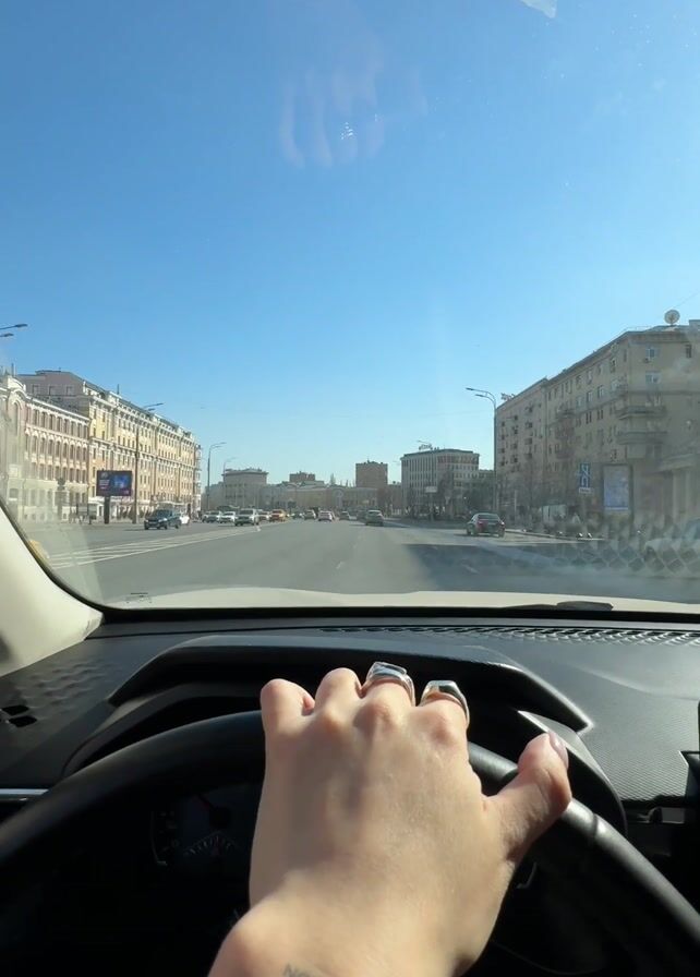 A first-person perspective from the driver's seat of a car moving along a city street on a bright, sunny day. The driver's left hand is visible on the steering wheel, adorned with multiple rings and a small "NOW" tattoo on the wrist. The cityscape features buildings on either side of a wide avenue, with cars visible in both directions. The sky is clear and blue, with slight reflection visible on the windshield. The dashboard of the car is visible, showing interior car details. The overall atmosphere is calm and casual, suggesting a normal drive in an urban environment.