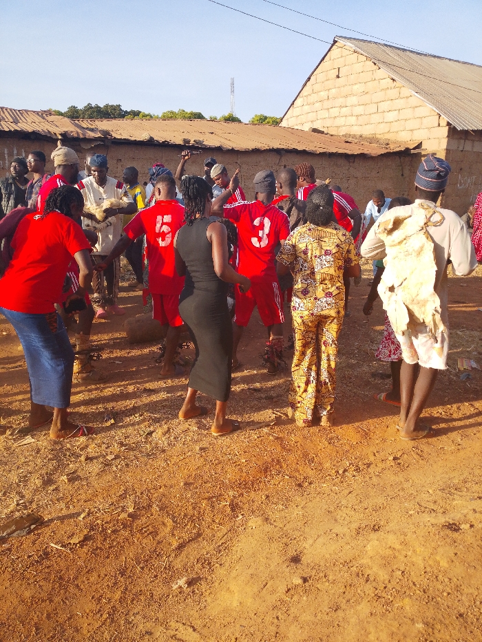 A group of people is gathered in a village setting. Several are dressed in red soccer jerseys with numbers 3 and 5 visible. A woman in a black dress and another in a patterned yellow outfit stand among them. Some individuals carry an animal hide. A dirt ground surrounds the group, and modest buildings with corrugated metal roofs form the backdrop. The lighting suggests it's daytime with sunlight casting shadows.