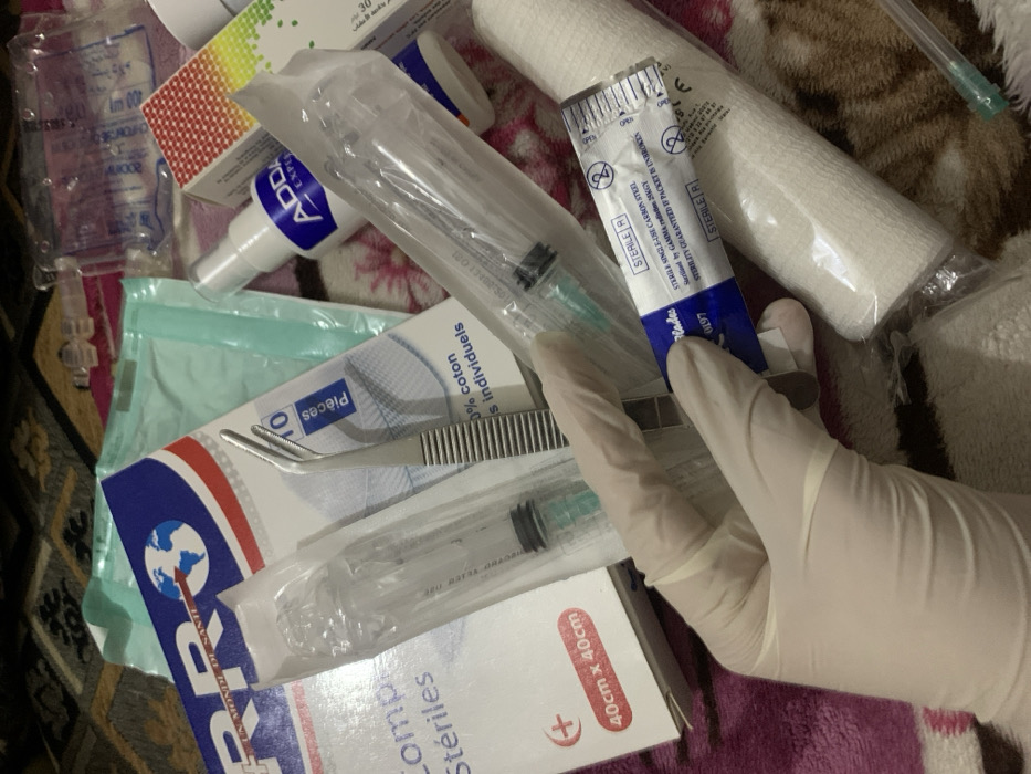 collection of medical supplies. A gloved hand holds a "Sterile R" packaged needle. Other visible items include rolls of bandages, syringes in packaging, a pair of metal tweezers, a box labeled "10 Pièces 100% coton s individuels," a spray bottle labeled "ADDA EXPERT," and a box labeled "Comp Stériles 40cm x 40cm." A transparent plastic IV bag is also present. The overall impression is a chaotic arrangement of medical equipment.