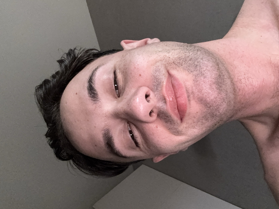 A male individual is featured in a close-up, selfie-style photograph taken from a low angle