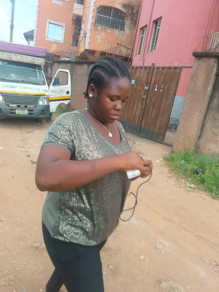 A woman with braided hair walks outdoors, looking at a small white device with a black cord in her hands. She wears a shimmering green top and black pants. Behind her, a white truck with a mattress on top displays "GOVERNMENT OF ANAMBRA STATE." Buildings in shades of orange and pink stand nearby, along with a rusty gate and some greenery. The ground appears to be dirt or gravel.