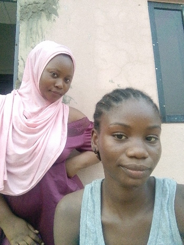 Two dark-skinned women pose close to each other. One wears a pink hijab and a maroon top with lace details on the shoulder. The other is in front wearing a sleeveless gray shirt with her hair braided back. They stand against a pale, textured wall, a black-framed window visible on the right. The lighting is natural, suggesting an outdoor setting.
