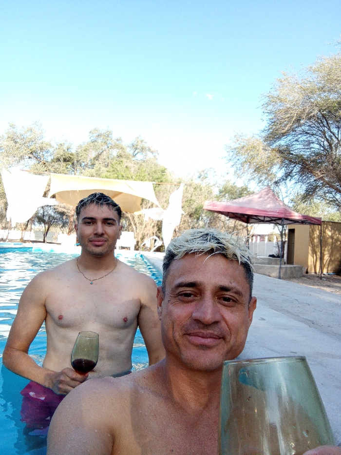 Two shirtless men are in a pool with drinks. The man in the foreground is holding a clear glass, while the man behind him holds a glass filled with a dark red liquid. The older man in the foreground has blond-streaked hair and a smile. The younger man behind him has dark hair and a gold necklace. In the background are draped white tarps, trees, and a building with a red canopy.