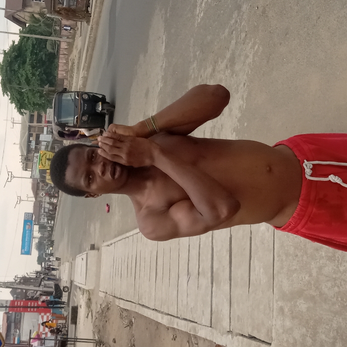 A shirtless man in red shorts stands on a sidewalk next to a street. He has his hands near his face, possibly covering his ears. A three-wheeled vehicle is on the road. The background includes buildings, streetlights, and trees. The sky is overcast. The image has been rotated.