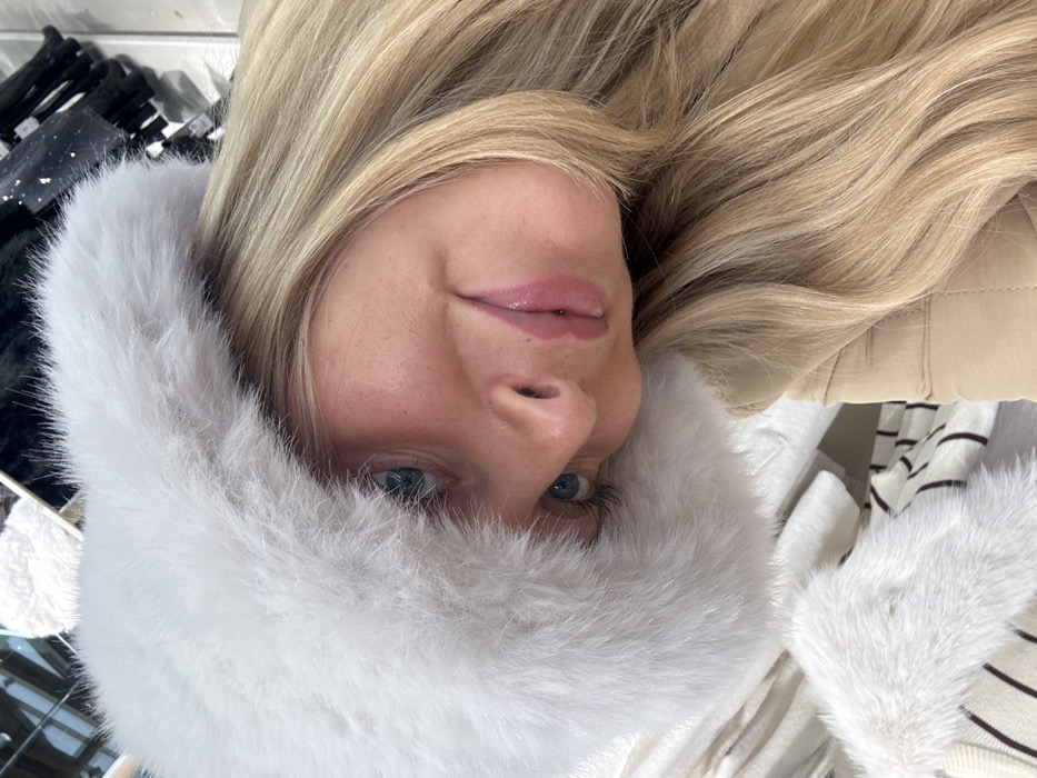 A woman poses upside down, gazing upwards with blue eyes and slightly parted lips. She wears a white, fluffy fur hood framing her face, which is surrounded by long, blonde hair. The background contains a mix of textures, including a beige quilted jacket and glimpses of clothing racks displaying dark and striped garments. The overall composition is light and bright, with a focus on the woman's facial features.
