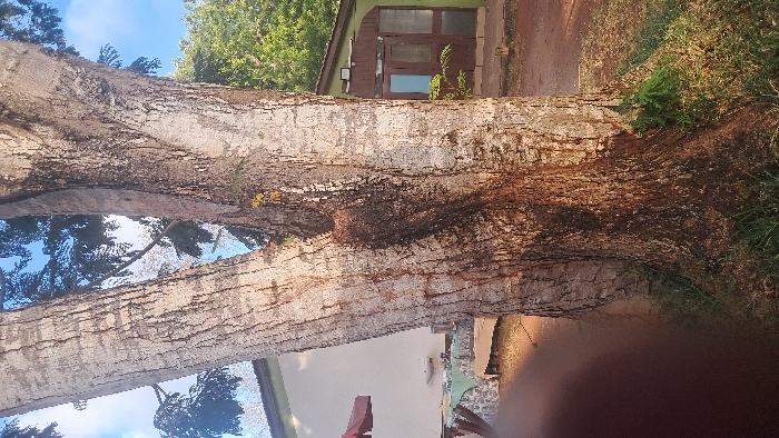 The image displays an outdoor scene in Waa Ngombeni ward, Kenya, dominated by a large tree with a bifurcated trunk in the central foreground. The tree's bark exhibits a textured appearance, primarily light greyish-white and darker brown with vertical fissures. A dark, irregular stain is prominent on the right trunk segment near the point of bifurcation. Small clusters of light green growth are present on the bark. The ground surrounding the tree consists of reddish-brown soil with patches of green grass. In the left background, a white building with a green-trimmed roofline is partially visible. A red outdoor umbrella stands next to a table covered with a patterned tablecloth, on which a light-colored, possibly metallic, object is situated. A blurred, dark, irregular shape obscures the lower-left corner of the frame. To the right of the tree, in the background, a light-green building with a brown roof and two brown wooden doors is visible. One door incorporates a rectangular light blue glass panel. Green foliage is present around and behind this structure. The sky above is clear blue with minimal white cloud cover. No individuals are depicted.