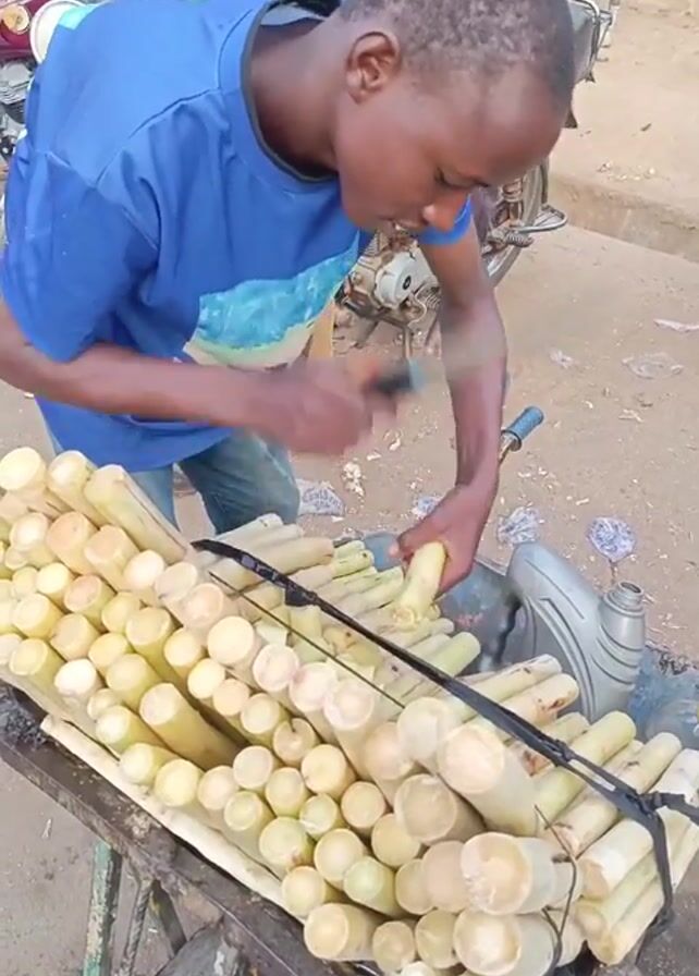 - "A young man in a blue T-shirt is cutting pieces of sugarcane with a knife on a metal cart in an outdoor setting" by FM-eoEuF2, licensed under CC BY 4.0