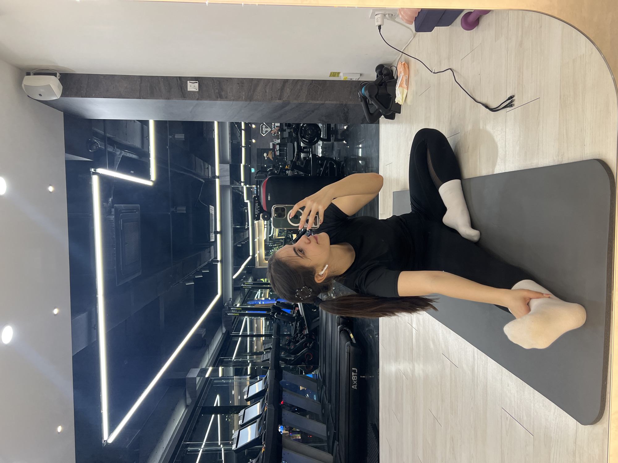 The image captures a female individual seated on a gray yoga mat in a gym, specifically D'GYM located in Daegu, South Korea, taking a mirror selfie. The subject has dark hair styled in a ponytail, adorned with a white star-shaped clip, and is wearing white wireless earbuds. She is dressed in a black short-sleeved top, black leggings with mesh panels, and white ankle socks. Her left leg is extended forward, with her left hand touching her foot, indicating a stretch. Her right leg is bent. She holds an iPhone, equipped with a magnetic ring, in her right hand, angled to capture her reflection in a large, unframed mirror that constitutes the foreground. The gym interior, visible in the mirror's reflection, features a dark ceiling with prominent linear LED lights and recessed spotlights. A row of black treadmills, one partially labeled "Ax8TJ", along with other exercise equipment like a black punching bag and various weight machines, are visible in the background. The floor is a light-colored wood or laminate. A dark gray textured pillar and a white wall section are also reflected. On the floor to the right of the subject, a black multi-charger cable, a peach-colored package of wet wipes, a dark gray cylindrical object (possibly a foam roller), a small purple dumbbell, and a pink object are present. A white wall-mounted speaker is visible high on the right wall, with a white electrical outlet positioned below it.
