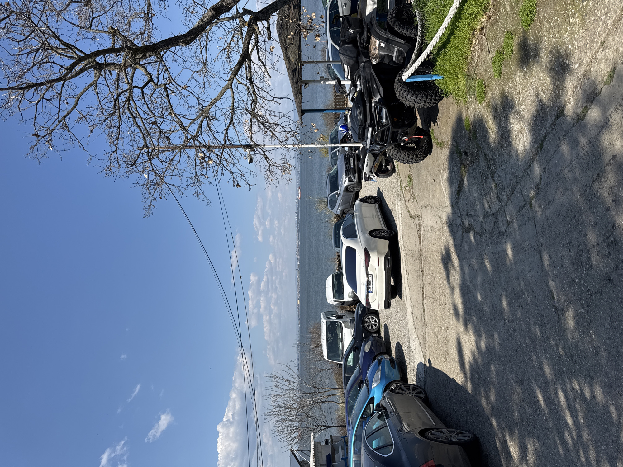 The image depicts a row of parked vehicles alongside a paved area, possibly a parking lot, with a body of water (likely the Black Sea) visible in the background. The vehicles range in color from dark blue/black to white and include cars, vans, and an all-terrain vehicle (ATV). The ATV is located closest to the foreground on the right side of the image. A bare-branched tree is visible in the upper left corner of the image, and the sky is blue with scattered clouds. The ground shows shadows cast by the tree and other objects. Although identifying the precise location within the city of Burgas, Bulgaria is not directly evident from the image, the presence of a body of water (likely the Black Sea) is consistent with the geographical location of Burgas.