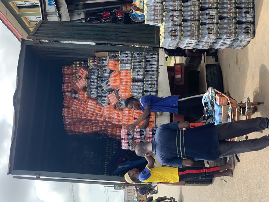 The scene is in Ondo, Nigeria, at the coordinates 7.251 latitude and 5.196 longitude. Three men stand near a delivery truck. The truck bed is full of cases of bottled beverages. One man is loading the truck with a case of bottled beverages. One man is standing near the truck with his hands on his hips. The third man is facing the camera and appears to be waiting. The truck has a large, green tarp on the side. The road is paved and there are other vehicles in the distance. There is a wheelbarrow with various items in the scene. The background is a typical African city with buildings and shops.