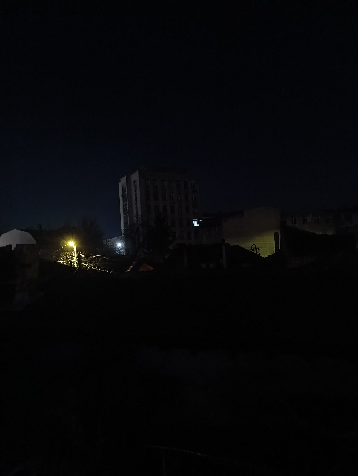An overhead night-time photograph depicts an urban panorama in Silistra, Bulgaria. The scene is dominated by an intensely dark sky. In the mid-ground, a multi-story building with a distinct facade featuring numerous windows is visible; one window on its right side exhibits a prominent white light. To the immediate right of this structure, a lower building section presents a flat, light-colored wall, sharply illuminated from an unseen source. To the left of the central view, a bright yellow-orange street lamp atop a utility pole provides local illumination, revealing a network of overhead wires extending from it. Further left and slightly behind the street lamp, a faint, light-colored structure, possibly domed or tent-like, is partially discernible. The foreground and lower mid-ground consist of dark, indistinct building rooftops and architectural forms, rendered in silhouette against the minimal artificial light sources. No individuals or specific activities are visible.