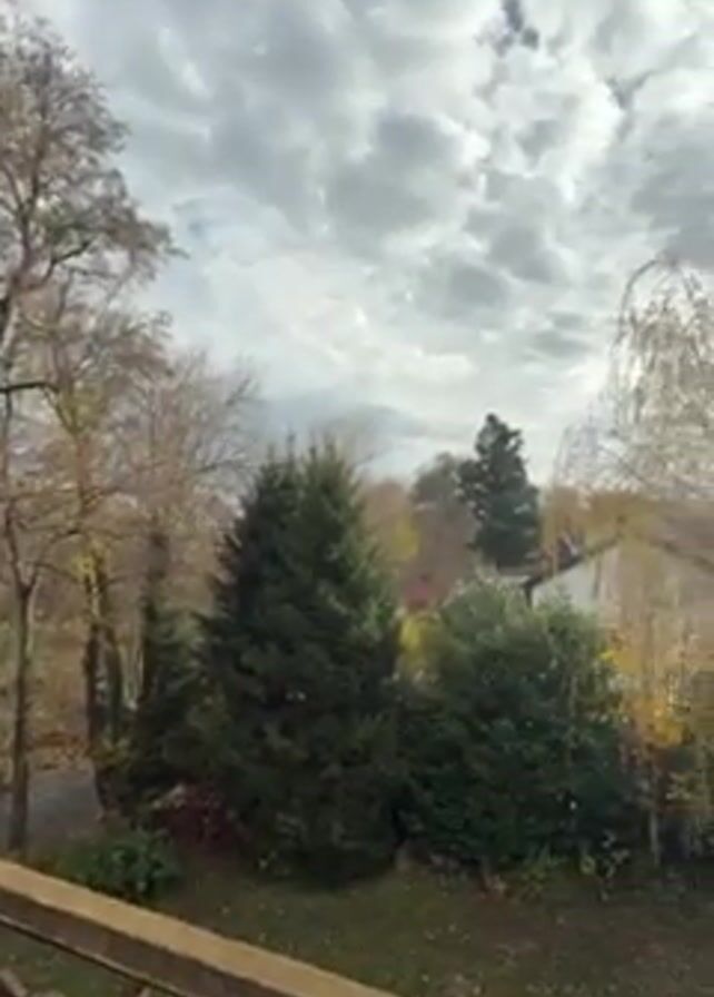 n outdoor view from a balcony. The sky is cloudy with a few glimpses of sunlight. There are trees and houses in the background. The balcony has a brown railing. There are some bins in view at the bottom of the frame.