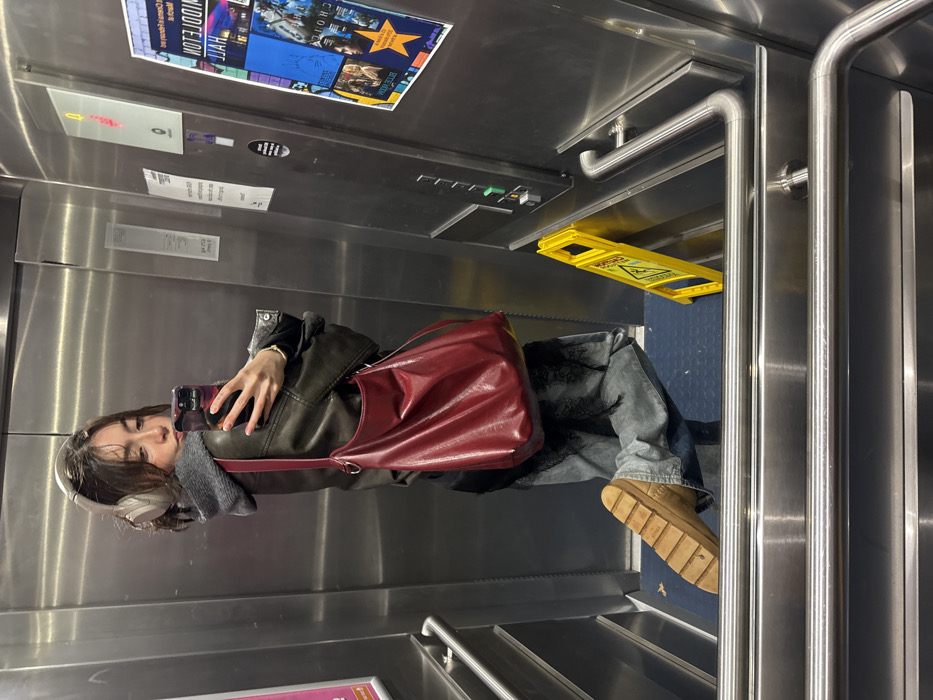 The image depicts a female individual taking a mirror selfie inside an elevator cab, located in Hull, United Kingdom, specifically identifiable by a mirrored poster for "MIDDLETON HALL" affixed to the right wall, a venue associated with the University of Hull. The elevator interior features brushed stainless steel panels on the walls and a dark blue floor with a raised circular anti-slip pattern. Stainless steel handrails are present at waist height on both side walls and at the bottom of the frame. A vertical control panel on the right wall contains multiple rectangular buttons and an illuminated display showing the digit '0'. Below this, a yellow A-frame "CAUTION WET FLOOR" sign is placed on the floor. The subject, a young female, is positioned facing the mirror, holding a dark-colored smartphone with a patterned case in her right hand to capture her reflection. She wears light-colored over-ear headphones, a dark olive-green or brown leather-look jacket over a grey hooded sweatshirt, a black undershirt, and light-colored distressed denim jeans with dark patterns. A large, slouchy, deep red or burgundy shoulder bag hangs from her right shoulder. Her right leg is extended, while her left leg is bent at the knee, displaying the ridged sole of a tan platform boot or shoe resting on the floor. A gold-colored bracelet is visible on her left wrist.