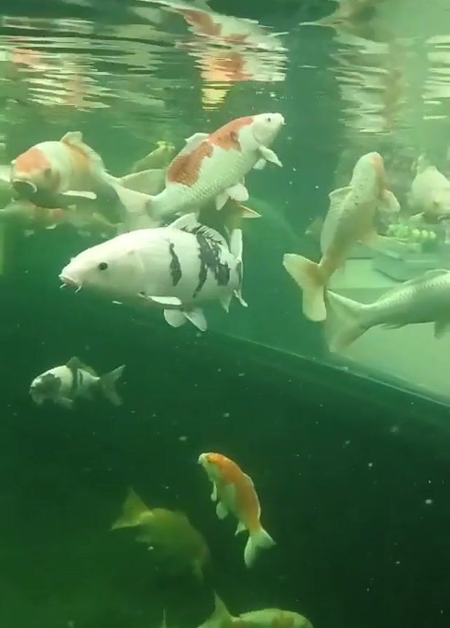The underwater footage shows a collection of koi fish of different colors swimming in a pond or large tank