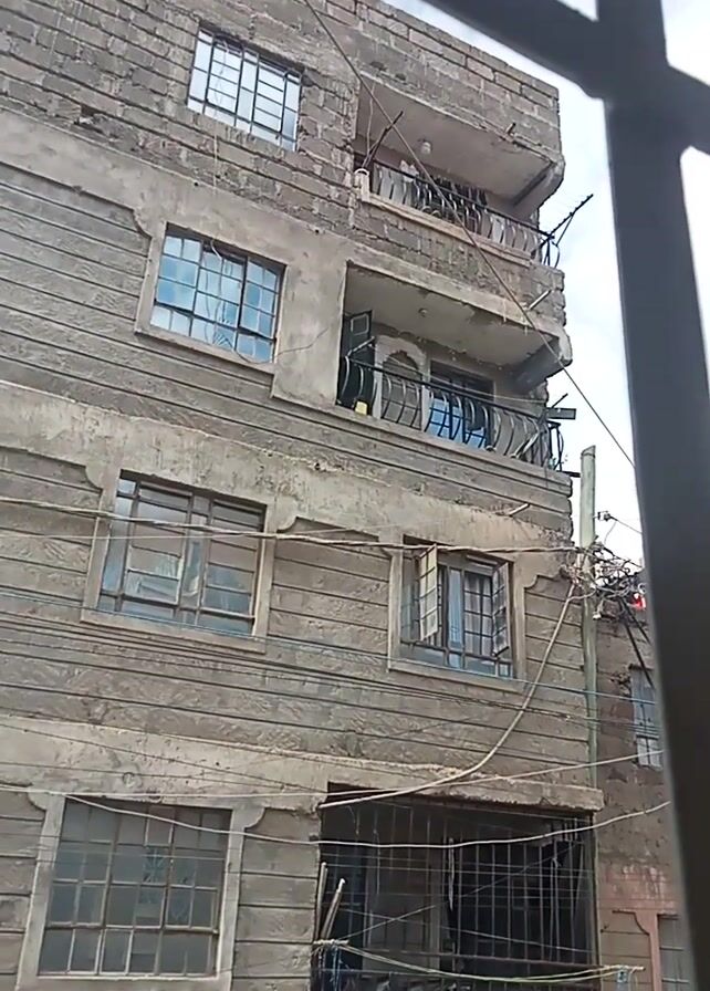 low-angle view of a concrete building with multiple windows, some with bars. A black tarp is visible on one window. The building has vertical lines suggesting paneling. The view is framed by what appears to be a window frame or bars of the viewing point. Wires and cables are visible at the top of the building. The sky is visible in the background. Audio includes speech, possibly children's voices.