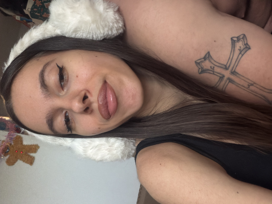 A frontal, close-up photograph depicts a female subject positioned slightly left of center, wearing white furry earmuffs and a black sleeveless garment. She has long, dark brown hair, winged eyeliner, and glossy, light brown lipstick. Her lips are slightly parted, and her gaze is directed towards the camera. To the right of the female subject, a second individual's upper right arm is visible, featuring a prominent tattoo of a stylized, shaded cross. The background consists of a light-colored wall. In the upper left quadrant, a gingerbread man-shaped Christmas ornament with red details is visible, alongside indistinct multi-colored festive decorations. A dark, indistinct object is present in the lower-left background. The location is specified as the city of Corby, United Kingdom.