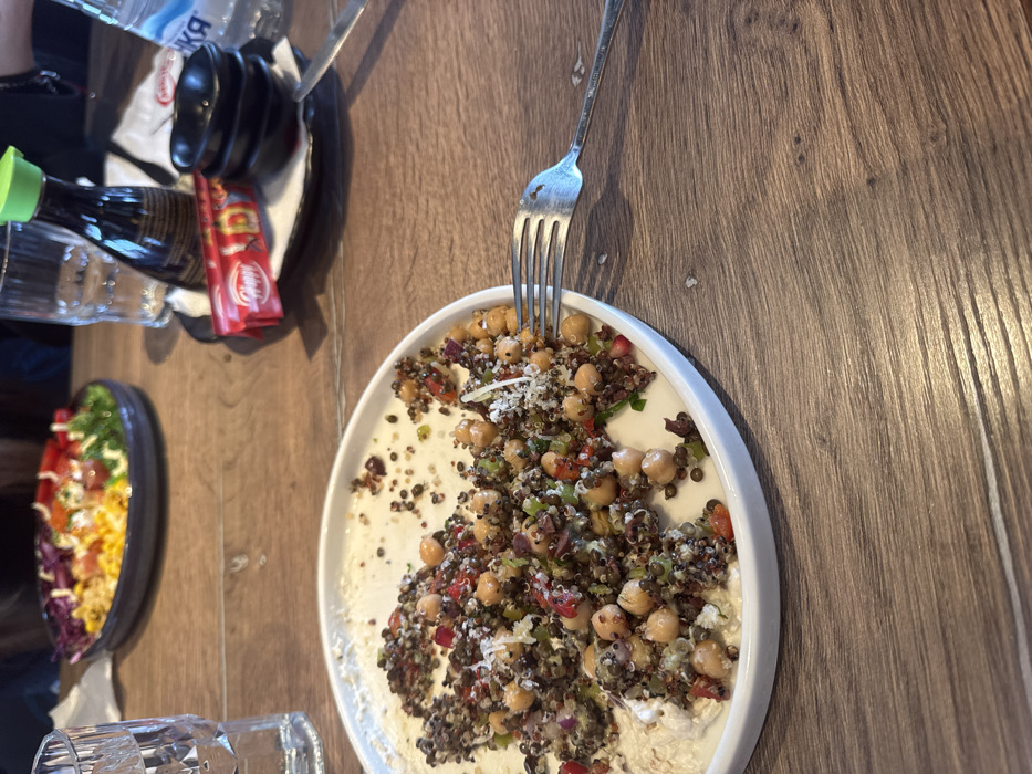 The image depicts an indoor dining scene at a restaurant or cafe in Plovdiv, Bulgaria. The primary focus is a partially consumed meal on a round, white plate in the foreground, consisting of a base layer of a light-colored spread, topped with a salad mix of quinoa (dark and light varieties), chickpeas, diced red and green vegetables (possibly peppers and pomegranate seeds), and a white crumbled substance, likely cheese. A silver four-tine fork rests on the right edge of this plate, with remnants of food on its tines. The table surface is a light-brown wooden material with a visible grain. To the left of the foreground plate, a clear, faceted drinking glass containing water is visible. To the right, a black circular tray holds a dark bottle with a light green cap (likely soy sauce), a stack of three small black dipping bowls, a red "Chupa Chups" wrapper, and a white paper napkin underneath these items. Adjacent to the tray is a clear plastic bottle of "Devin" mineral water with a blue label, confirming the Bulgarian location. In the background, a second dark-colored bowl containing a colorful, segmented salad or poke bowl is present. Blurred human figures are partially visible in the deep background, indicating the presence of other diners. The scene is well-lit, suggesting an ambient daytime or brightly lit evening setting.