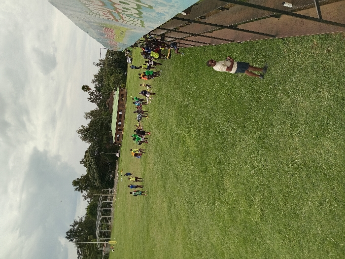 The image displays an outdoor sports ground in Nakuru, Kenya, under an overcast sky