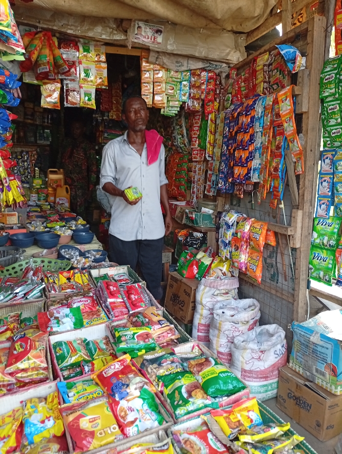 The image displays an open-front retail stall, likely a provision shop, located in the city of Unknown, Unknown