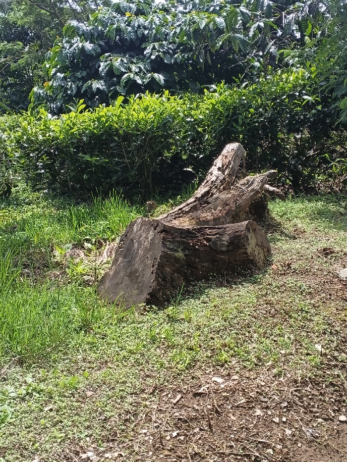 A weathered log rests on a grassy incline, punctuated by bare soil and sparse growth. Lush greenery forms a backdrop, with dense foliage filling the upper portion of the frame. The log exhibits signs of decay, with cracked and splintered wood visible. The scene evokes a sense of natural tranquility, with the interplay of light and shadow adding depth to the composition.
