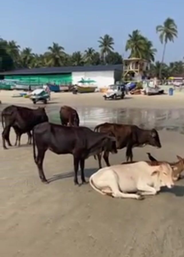The video depicts a bright sunny day on a beach. In the foreground, there is a small herd of cows, with a couple standing and others lying on the sand. The cows are varying shades of brown and white. Behind the cows, there is evidence of human presence on the beach. There are boats, kayaks, and a lifeguard tower visible, as well as scattered beach umbrellas and people walking and standing along the shoreline. Palm trees dot the scene and a mountain range is in the background.