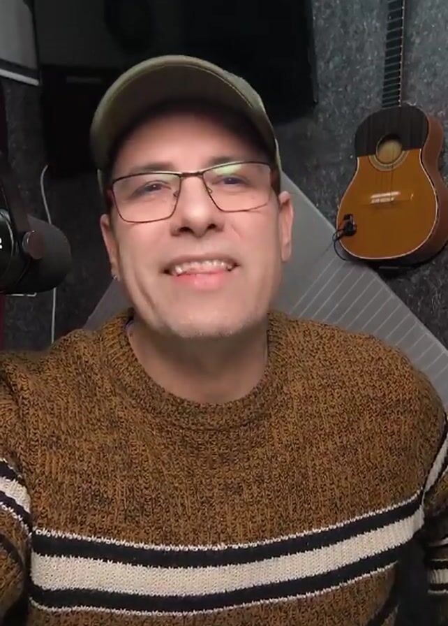 man in a brown and white striped sweater and a baseball cap speaking to the camera. He is wearing glasses. Behind him is a musical instrument, perhaps a guitar. There is also a microphone visible. The man smiles and seems to be talking about his work.