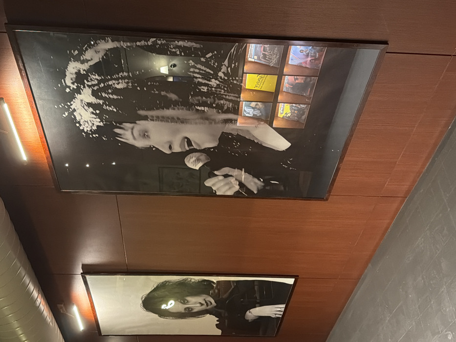 An interior view depicts a hallway or corridor within a cultural establishment in Yerevan, Armenia. The walls are covered with reddish-brown wood paneling. The floor is dark gray, composed of rectangular tiles. The ceiling features corrugated metallic paneling with visible linear light fixtures. Two large, vertically oriented, framed black and white photographs are mounted on the wooden wall. The photograph on the left portrays a woman (identified as Shushan Petrosyan) from the chest up, with dark, curly hair, looking directly forward. She wears dark attire, and her left hand, adorned with a ring, rests on a dark surface. The photograph on the right, larger than the left, depicts a woman (identified as Sirusho) in a performance pose, singing into a microphone with her mouth open. Her hair is styled with braids or textured elements. Integrated into the lower right quadrant of this frame is a lighted display shelf featuring eight compartments, each holding a colored album cover or media sleeve. Observable titles include "SPACE" and a yellow cover with "Vodka" or similar text. Both photographs are individually illuminated from above by linear LED light fixtures, also mounted on the wooden wall. Reflections of overhead lights and a wall sconce are visible on the glass surfaces of the framed artwork.