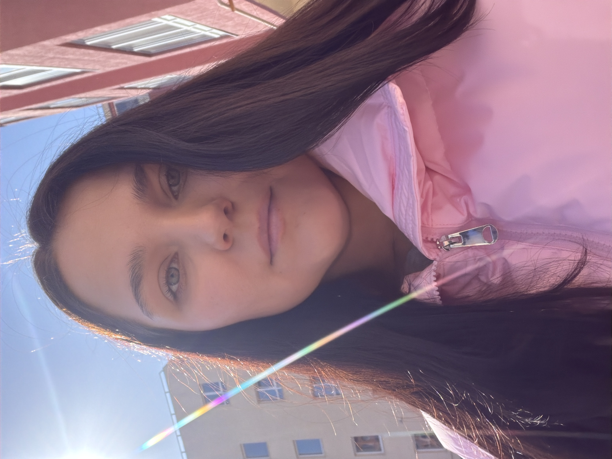 A young woman poses for a selfie outside, wearing a pink jacket. The location appears to be in Chaikovsky, Russia, indicated by the architecture visible in the background. The photo is taken at an angle, with the sun brightly shining in the corner of the frame. A rainbow flare is present in the picture, likely due to the sun reflecting off the camera lens.